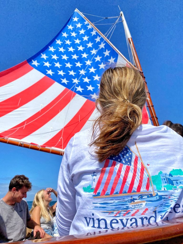 Tigress‘s American Flag sail is a tribute to the catboat Cleopatra that sailed these waters during the Civil War. It is said that her painted sail was a means to heal some of the pain caused by the great division of the war.